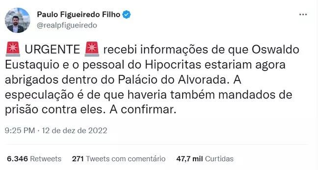 No mesmo dia, o jornalista Paulo Figueiredo, da Jovem Pan, escreveu no Twitter que Eustáquio e "o pessoal do Hipócritas" poderiam ter mandados de prisão contra eles, e que por isso teriam ido ao Palácio do Alvorada. A alegação se espalhou nas redes de apoio a presidente, vinculando os mandados a um suposto "crime de opinião".