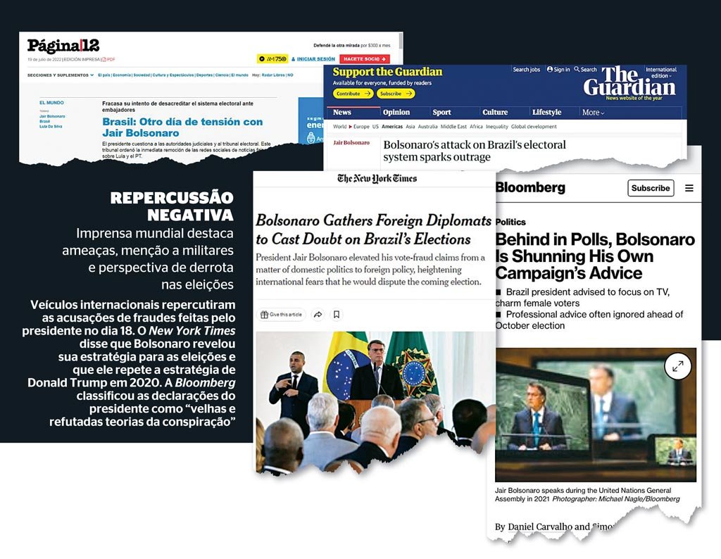A imprensa estrangeira registrou o fiasco. O New York Times disse que o Bolsonaro revelou sua estratégia para as eleições, nas quais as pesquisas apontam uma derrota “de forma esmagadora”. O veículo registrou que diplomatas se mostraram “abalados” pelas alegações sobre as falhas no processo eleitoral, assim como pela pregação da participação dos militares no processo. A impressão, de acordo com diplomatas ouvidos pelo jornal americano, é de que o presidente está preparando as bases para contestar os resultados se ele perder. É a estratégia usada por Trump nos EUA, lembrou o periódico. A Bloomberg, principal serviço de notícias financeiras do mundo, classificou os questionamentos de Bolsonaro como “velhas e refutadas teorias da conspiração”.