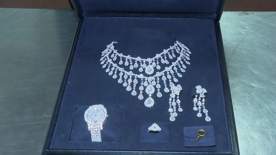 Bolsonaro recebeu três caixas de joias. A primeira, com colar de diamantes, seria para Michelle Bolsonaro. Acabou apreendida pela Receita Federal em outubro.