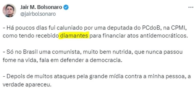 "Há poucos dias fui caluniado por uma deputada do PCdoB, na CPMI, como tendo recebido diamantes para financiar atos antidemocráticos. Só no Brasil uma comunista, muito bem nutrida, que nunca passou fome na vida, fala em defender a democracia. Depois de muitos ataques pela grande mídia contra a minha pessoa, a verdade apareceu", escreveu o ex-mandatário, junto ao print de uma reportagem da Folha de S. Paulo sobre o assunto.