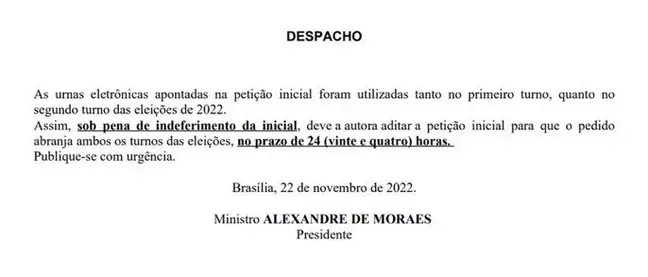 “Assim, sob pena de indeferimento da inicial, deve a autora aditar a petição inicial para que o pedido abranja ambos os turnos das eleições, no prazo de 24 (vinte e quatro) horas. Publique-se com urgência”, escreveu o ministro na decisão.