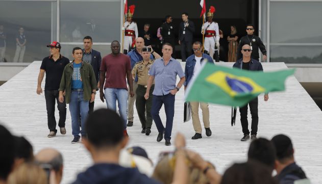 Após uma semana marcada pelo clima de tensão com o Supremo Tribunal Federal, o presidente Jair Bolsonaro participou brevemente de manifestação na manhã deste domingo que tem entre seus motes ataques contra a Corte e defesa do governo federal. Cercado por seguranças, o presidente circulou no local onde os manifestantes se reúnem, na Esplanada dos Ministérios, em Brasília, mas não discursou.