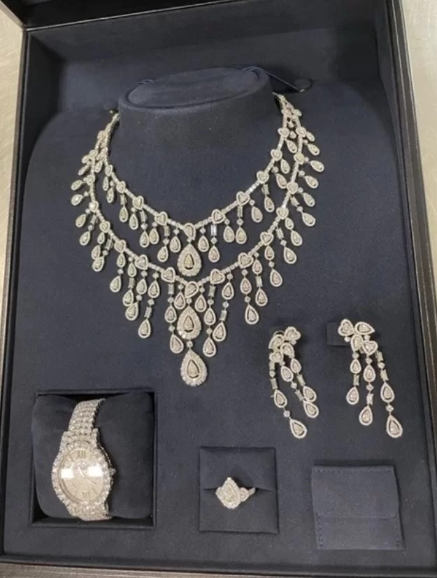 O conjunto de peças de diamantes, que inclui colar, par de brincos, anel e relógio, estava na mochila de um assessor do então ministro de Minas e Energia, Bento Albuquerque, quando a comitiva desembarcou no Brasil, no dia 26 de outubro de 2021, após viagem para a Arábia Saudita. As joias seriam um presente do governo saudita para a então primeira-dama Michelle Bolsonaro.