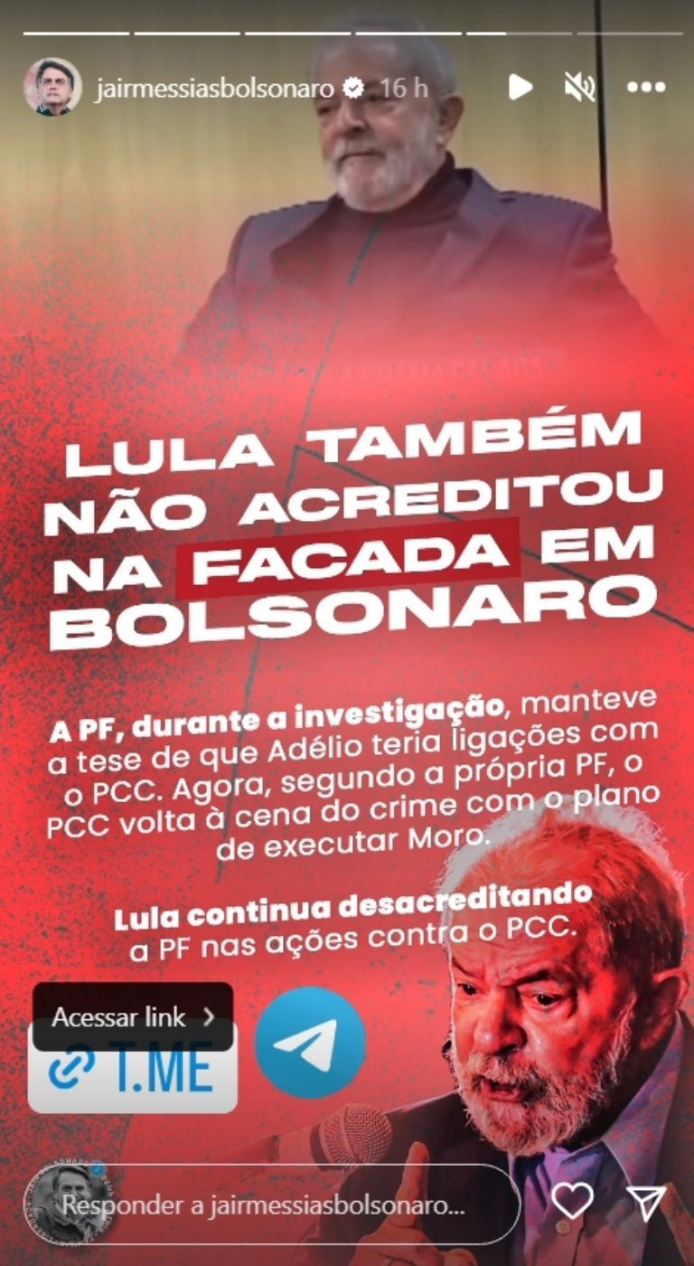 "Lula também não acreditou na facada em Bolsonaro", diz a imagem divulgada nos stories do Instagram, que remete ao perfil do ex-presidente no Telegram.