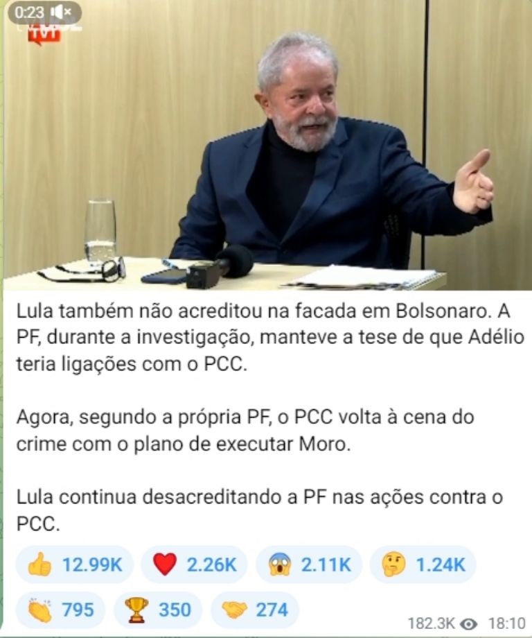"Agora, segundo a própria PF, o PCC volta à cena do crime com o plano de executar Moro. Lula continua desacreditando a PF nas ações contra o PCC", escreveu o ex-presidente aos radicais, posando de vítima e buscando ressuscitar, mais uma vez, o caso Adélio.