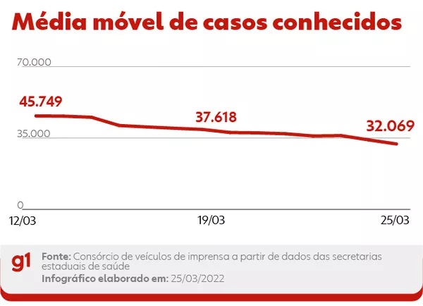 Em seu pior momento, a média móvel superou a marca de 188 mil casos conhecidos diários, no dia 31 de janeiro deste ano.