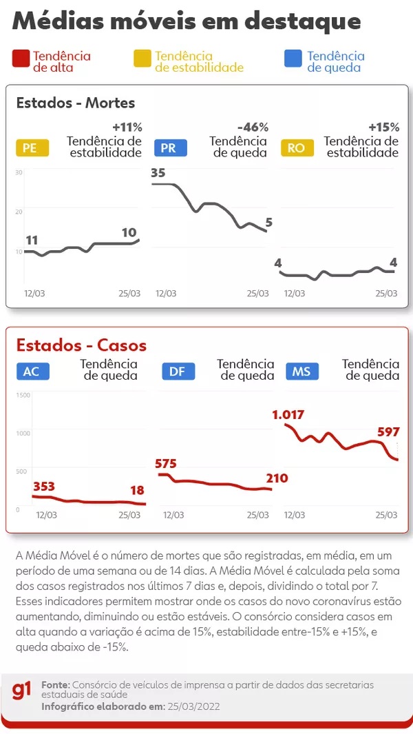 Vale ressaltar que há estados em que o baixo número médio de óbitos pode levar a grandes variações percentuais. Os números de médias móveis são, em geral, em números decimais e arredondados para facilitar a apresentação dos dados. Já a variação percentual para calcular a tendência (alta, estabilidade ou queda) leva em conta os números não arredondados.