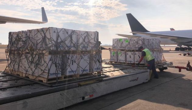 O país recebeu mais 1,5 milhão de doses do imunizante da Pfizer, que chegaram nesta segunda-feira (6) no Aeroporto Internacional de Viracopos, em Campinas (SP).