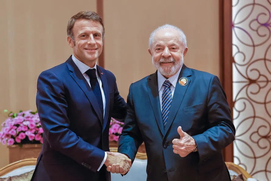 Lula com o presidente da França, Emmanuel Macron, em Nova Delhi