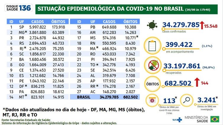 Ainda segundo o boletim, 33.197.861 pessoas se recuperaram da doença e 399.422 casos estão em acompanhamento. O boletim de hoje não traz os dados atualizados no Distrito Federal, Maranhão, Minas Gerais, Mato Grosso, Rio de Janeiro, Roraima, Tocantins e dos óbitos em Mato Grosso do Sul.Os números em geral são menores aos domingos, segundas-feiras ou nos dias seguintes aos feriados em razão da redução de equipes para a alimentação dos dados. Às terças-feiras e dois dias depois dos feriados, em geral, há mais registros diários pelo acúmulo de dados atualizado.