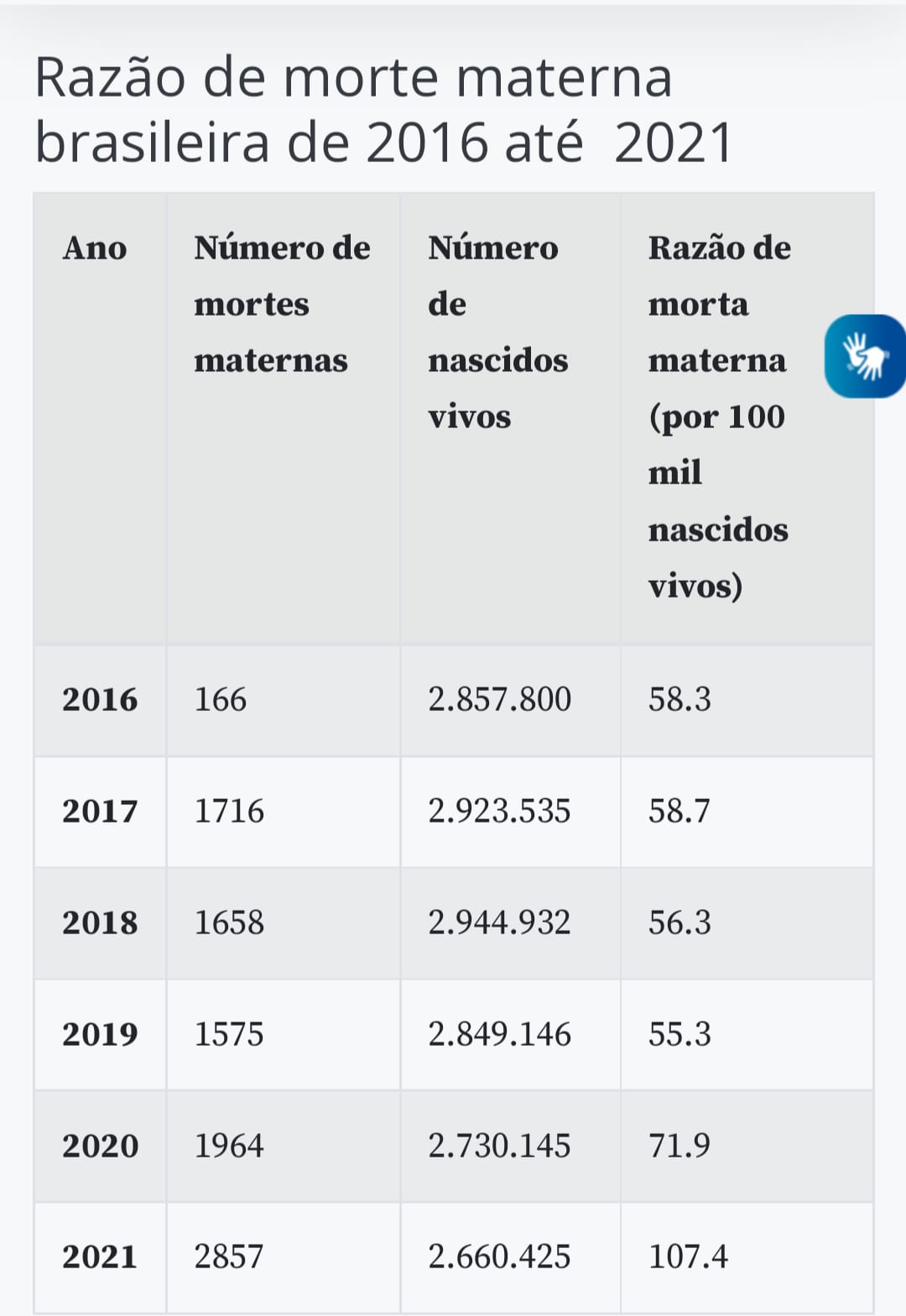Os dados são relativos ao número de óbitos de mulheres entre 10 e 49 anos ocorridos na gravidez, no parto ou no puerpério, porém não contabilizados pelo Ministério da Saúde por não terem sido classificados em uma das categorias predeterminadas para morte materna da classificação internacional de doenças (CID). O caso mais comum de morte materna obstétrica é a hipertensão arterial (eclampsia).