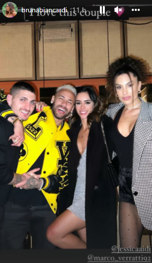 Após o encontro, Bruna publicou uma foto ao lado do ataque e de Marco Verrati, companheiro de Neymar no PSG, e sua noiva Jessica Aidi. "Amo esse casal", escreveu a influenciadora.