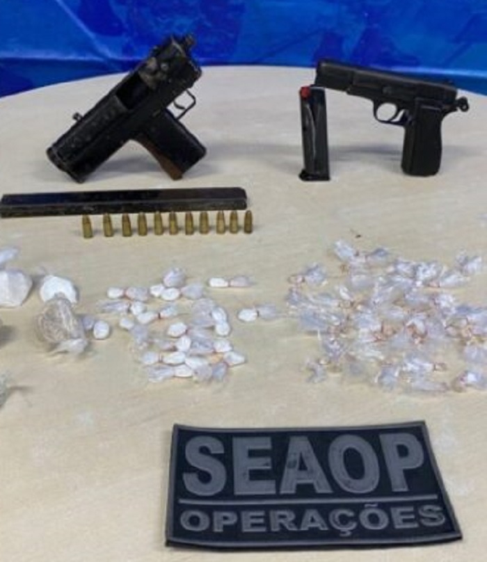 Durante a revista no interior da casa do casal traficante de drogas os policiais que atuavam na “Operação Amazonas mais Seguro”, encontraram escondidas dentro de um dos quartos, uma pistola e uma submetralhadora, ambas de calibre 9 milímetros, além de várias munições.