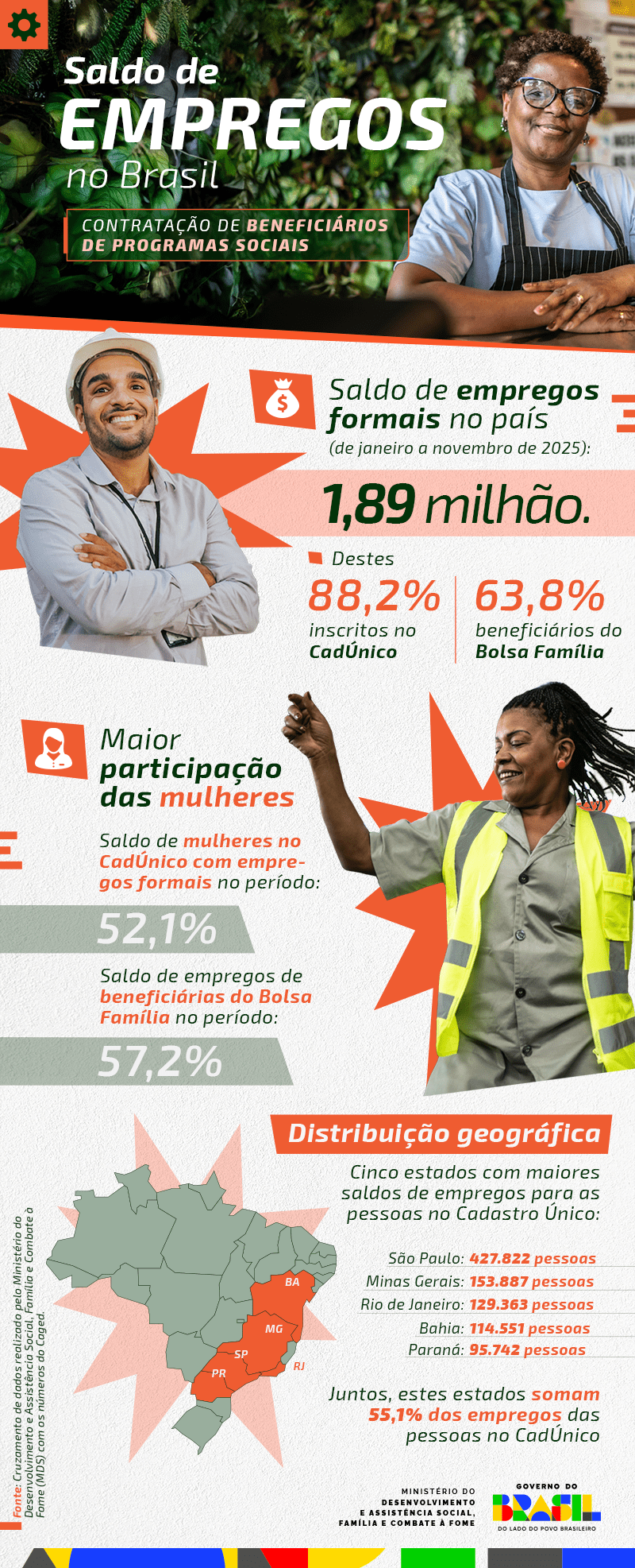 O mercado de trabalho brasileiro manteve uma trajetória consistente de crescimento em 2025. Entre janeiro e novembro do ano passado, o país registrou saldo positivo de 1.895.130 empregos formais. Desse total, 1.672.018 vagas (88,2%) foram preenchidas por pessoas inscritas no Cadastro Único (CadÚnico), principal instrumento de identificação de famílias em situação de vulnerabilidade social. Os dados evidenciam o alcance e a efetividade das políticas públicas voltadas à promoção da inclusão no mercado de trabalho formal.
