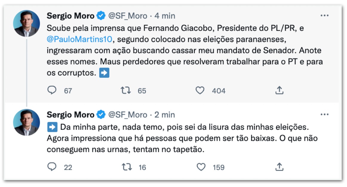 Em seu perfil no Twitter, ao comentar o pedido de cassação do PL do Paraná à Justiça Eleitoral, o ex-juiz disse que “nada teme” porque sabe da “lisura” de sua eleição. Afirmou que se impressiona “que há pessoas tão baixas”.