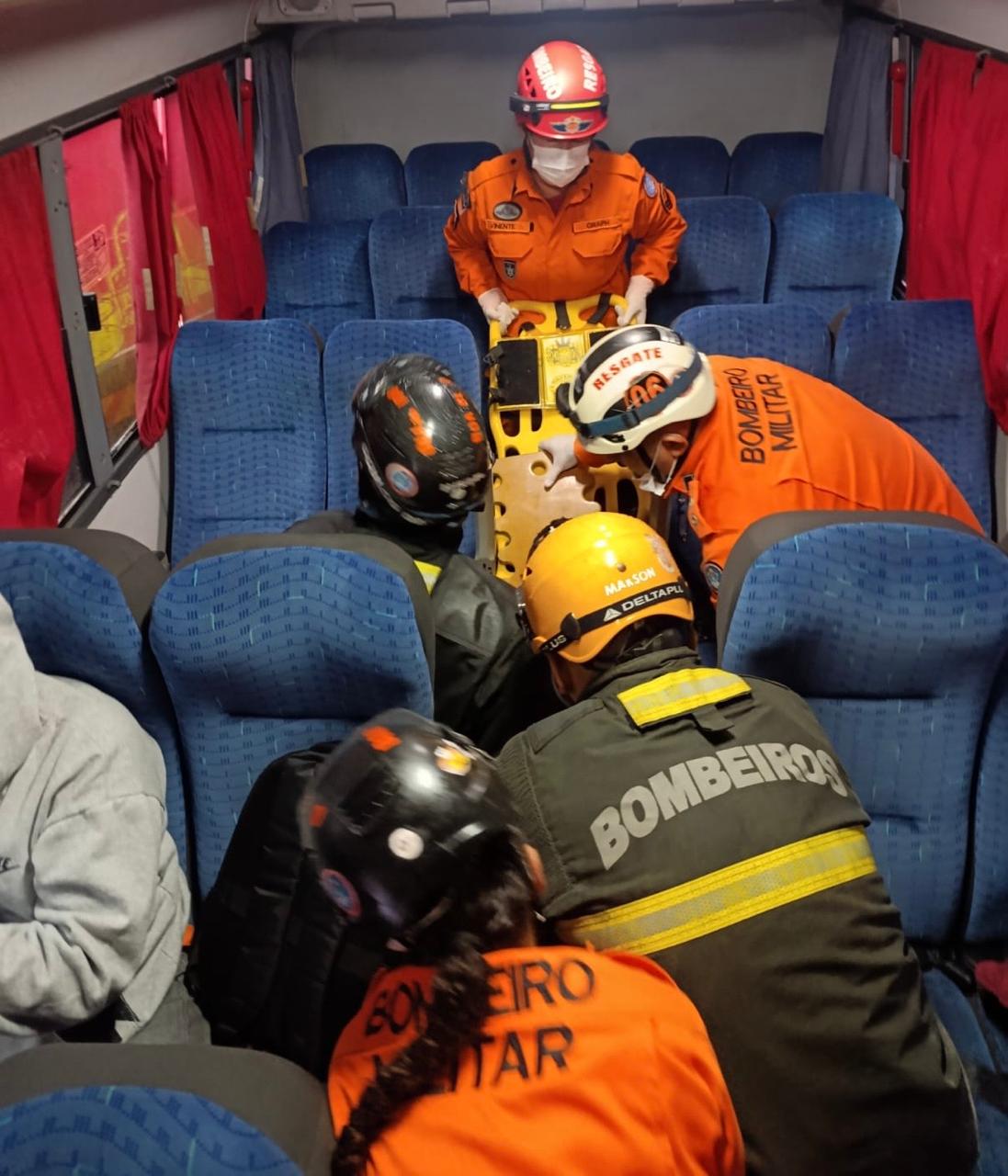 Dez vítimas estavam retidas dentro do micro-ônibus e foram resgatadas após o serviço de desencarceramento realizado por militares, que precisaram remover a porta do veículo.