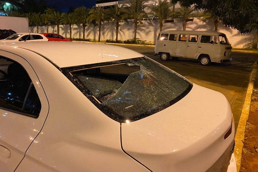 Manifestantes vestidos com camisas da Seleção Brasileira quebraram alguns carros estacionados em frente ao prédio da corporação