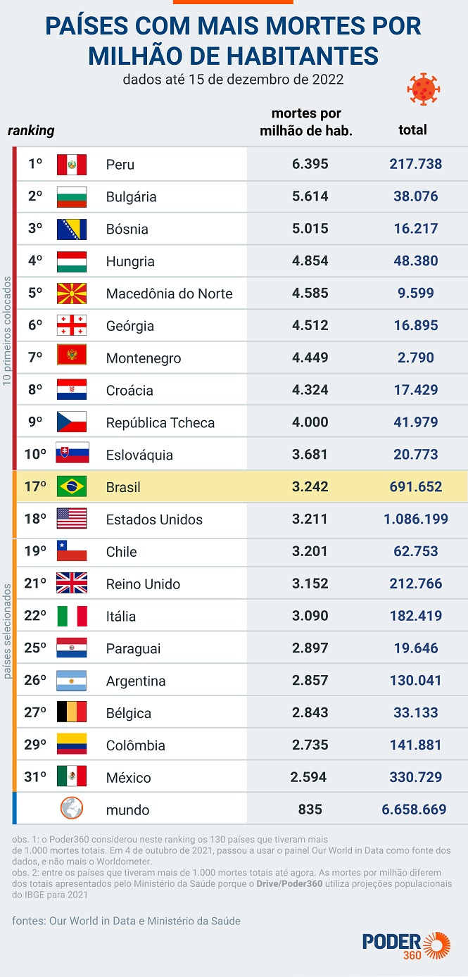A lista é liderada pelo Peru, que registra 6.395 mortes por milhão. É seguido pela Bulgária (5.614), Bósnia e Herzegovina (5.015) e Hungria (4.854).