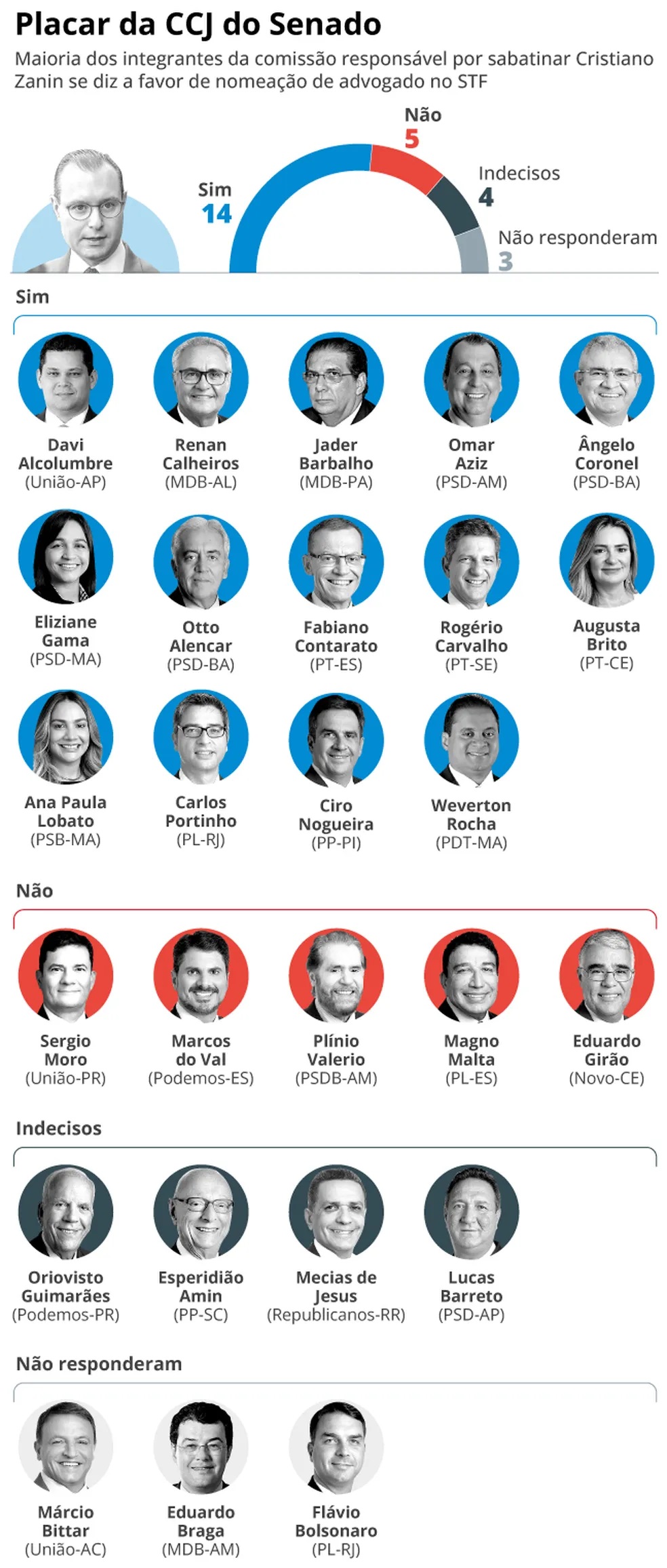 Em périplo por gabinetes de senadores buscando apoio à sua indicação para o Supremo Tribunal Federal (STF), o advogado Cristiano Zanin não deve enfrentar problemas para conseguir o aval da Comissão de Constituição e Justiça (CCJ), primeira etapa da análise no Senado. Dos atuais 26 titulares do colegiado, 14 disseram ao GLOBO que vão votar a favor da nomeação, incluindo integrantes da oposição, e apenas 5, contra, o que já garante a maioria ao nome escolhido pelo presidente Luiz Inácio Lula da Silva. Ao menos outros dois, embora prefiram não antecipar a posição, já elogiaram publicamente a decisão tomada pelo petista. A votação, ainda sem data para acontecer, é secreta na comissão e, depois, no plenário.
