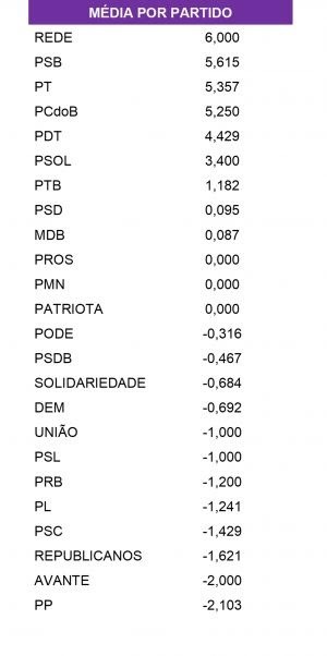 Posicionamento nas principais votações ligadas aos temas socioambientais – média por partido