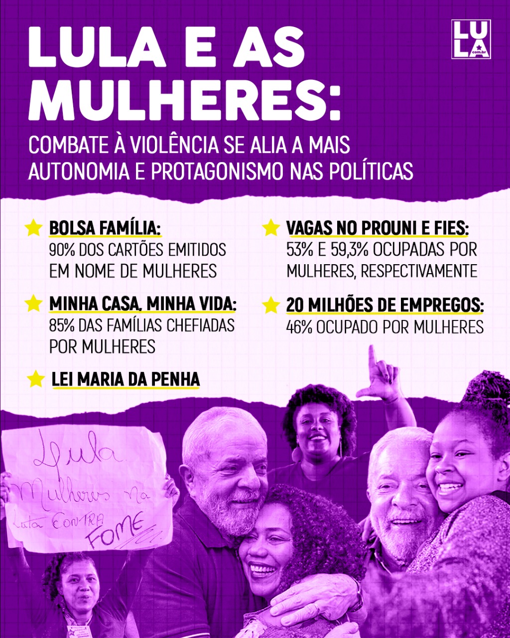 O recado do ex-presidente Luiz Inácio Lula da Silva é direto: “Mulher não quer ser coadjuvante. Ela quer, na verdade, ser o sujeito da história.Ela quer fazer a sua história“. Mais do que uma crença, é uma marca de suas duas gestões como presidente. É daí a causa de, até hoje, Lula ter tanto apoio entre as mulheres, que sentiram direito a direito lhes serem tomados e mais e mais problemas e violência surgirem ao longo da gestão de Jair Bolsonaro.
