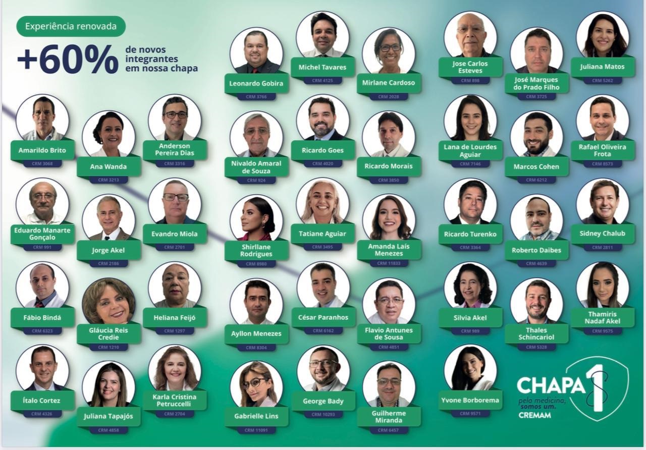 A Chapa 1 – Experiência Renovada tem profissionais veteranos e novatos na composição que juntos formam um grupo sólido em defesa da medicina no Amazonas. São eles: Tatiane Aguiar, Gláucia Credie, Amanda Puigcerver, Eduardo Manarte Gonçalo, Ricardo Goes, Ayllon Menezes, Jorge Akel, Nivaldo Amaral, Jose Carlos Esteves, Flavio Sousa Antunes, Ana Wanda, César Paranhos, Ricardo Morais, José Marques, Leonardo Gobira, Guilherme Miranda, Heliana Feijó, Marcos Cohen, Juliana Tapajós, Evandro Miola, Shirllane Barros, Karla Petrucceli, Thales Schincariol, George Bady, Rafael Oliveira, Ricardo Turenko, Lana Aguiar, Roberto Daibes, Thamires Akel, Ítalo Cortez, Gabrielle Lins, Yvone Borborema, Amarildo Brito, Sidnei Chalub, Anderson Dias, Juliana Matos, Michel Tavares, Fábio Bindá, Mirlane Cardoso e Silvia Akel.