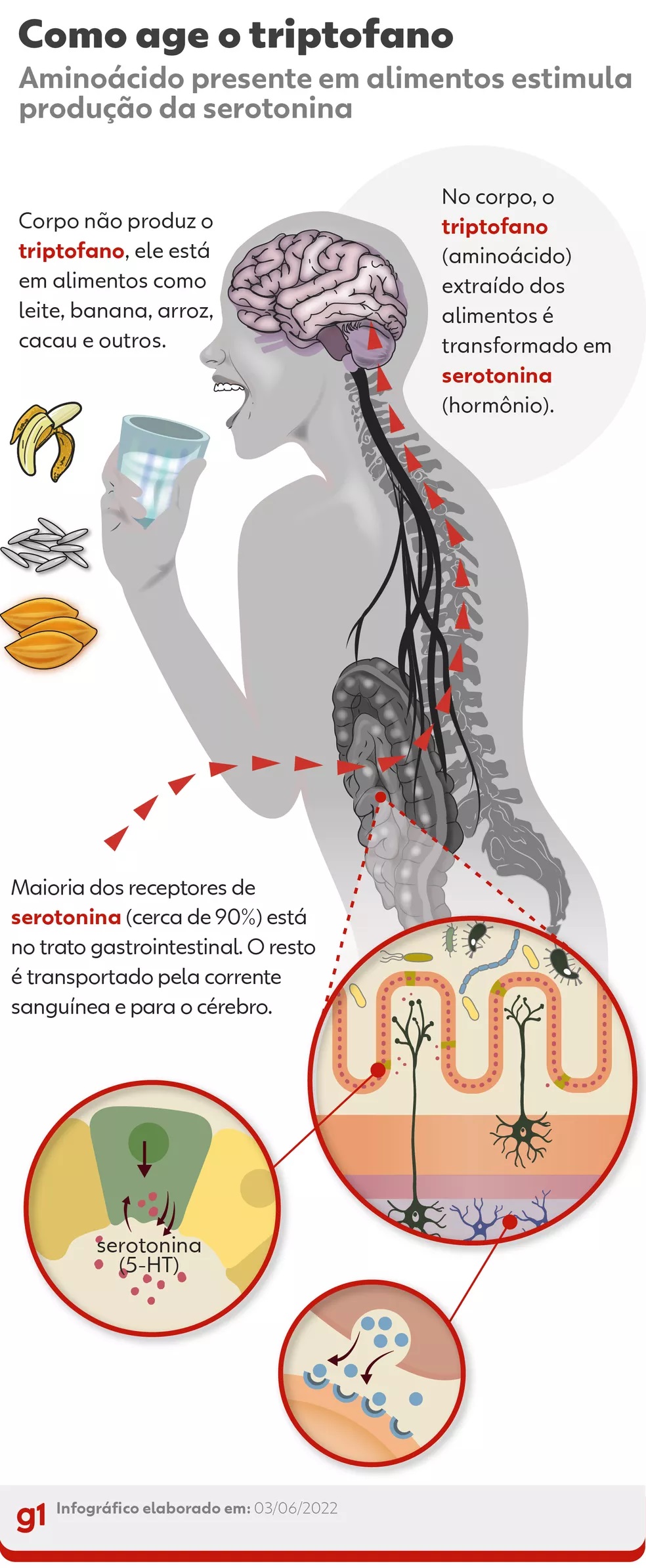 Como o triptofano é um aminoácido essencial (o corpo não o produz), precisamos ingerir alimentos ricos na substância (veja ilustração acima), e diversas comidas presentes no nosso dia a dia contêm triptofano. Não é preciso ir longe: cereais, carnes, frutas, peixes e até mesmo o leite contêm bons níveis da substância.