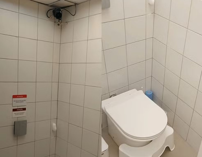 Diferentemente de outros ambientes, o cômodo não tem uma decoração chamativa. É todo feito com azulejos brancos. O diferencial acaba sendo uma placa pedindo para ninguém subir no vaso, por riscos de acidentes, e colocaram um banco para apoio para os pés, caso alguém tenha o intestino preso. Ah, e tem, sim, uma câmera em cima.