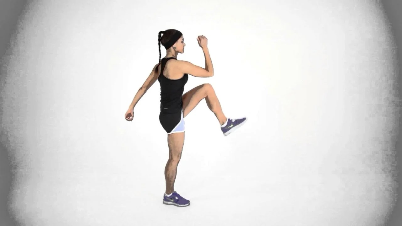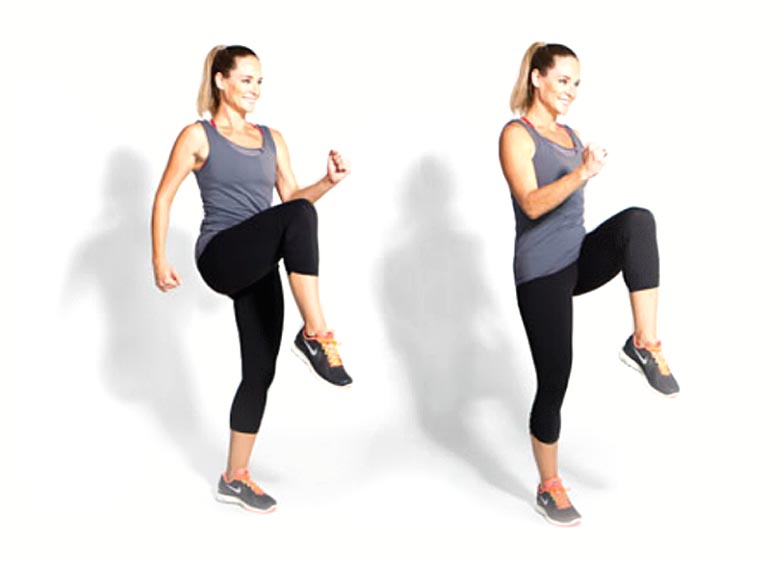 Você deverá ficar parado e simular os passos de uma corrida, elevando os joelhos o máximo que conseguir. “As corridas têm alto gasto calórico e, quando se empurra o calcanhar pro chão para levantar o joelho, se potencializa a ação localizada nos glúteos”, completa a especialista.
