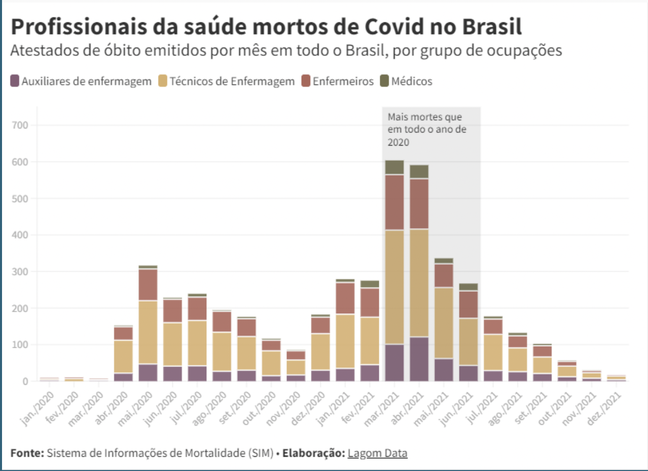 “Mesmo com dados ainda incompletos, é possível ver o quanto os profissionais da saúde foram atingidos no começo da pandemia por estarem mais expostos. Com a prioridade dada a eles na vacinação, os dados também mostram como vacina-los mais cedo derrubou as mortes antes do resto da população”, explica Marcelo Soares, jornalista pesquisador do Lagom Data.