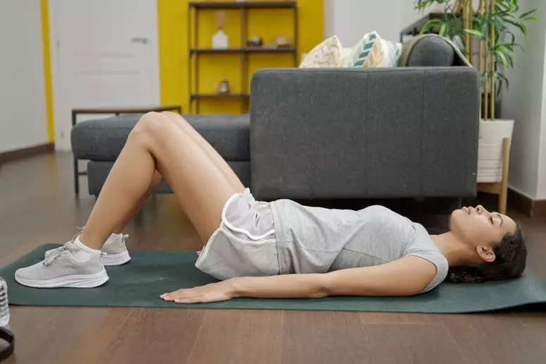 Deite-se com os braços ao lado do corpo, as pernas flexionadas e os pés apoiados no chão, próximos ao glúteo. Inspire e, ao expirar, suba o quadril, fazendo uma ponte, articulando a coluna. Vá descolando vértebra por vértebra ao chão, começando pela lombar até o quadril chegar lá em cima. Inspire novamente e desça o quadril, encostando vértebra por vértebra no chão, até a lombar ficar totalmente apoiada. Faça de 8 a 10 repetições deste exercício.