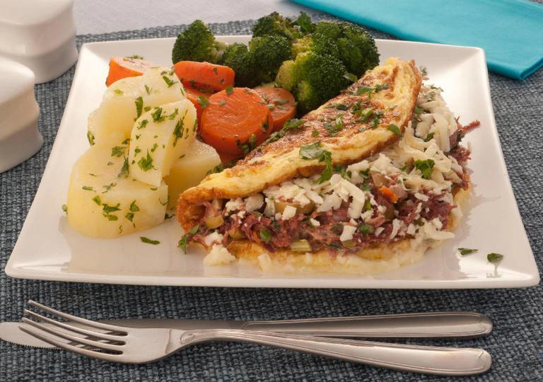 Em uma vasilha, coloque os ovos, o leite e o sal e misture com um garfo. Divida em 3 partes e frite uma de cada vez, em uma frigideira antiaderente média, untada com óleo até dourar dos dois lados. Divida o recheio reservado e o queijo meia cura entre as omeletes e dobre ao meio. Sirva.