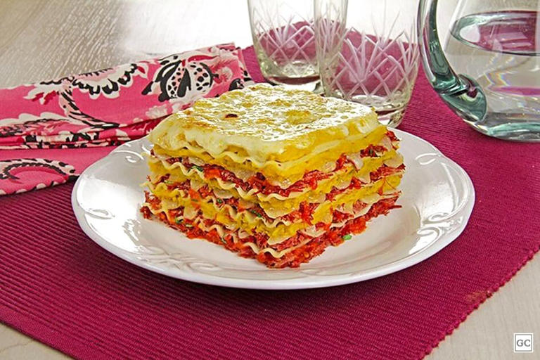 Para a montagem, forre um refratário médio com um pouco do refogado e por cima faça camadas de massa de lasanha, de refogado novamente, de mussarela fatiada e de purê.