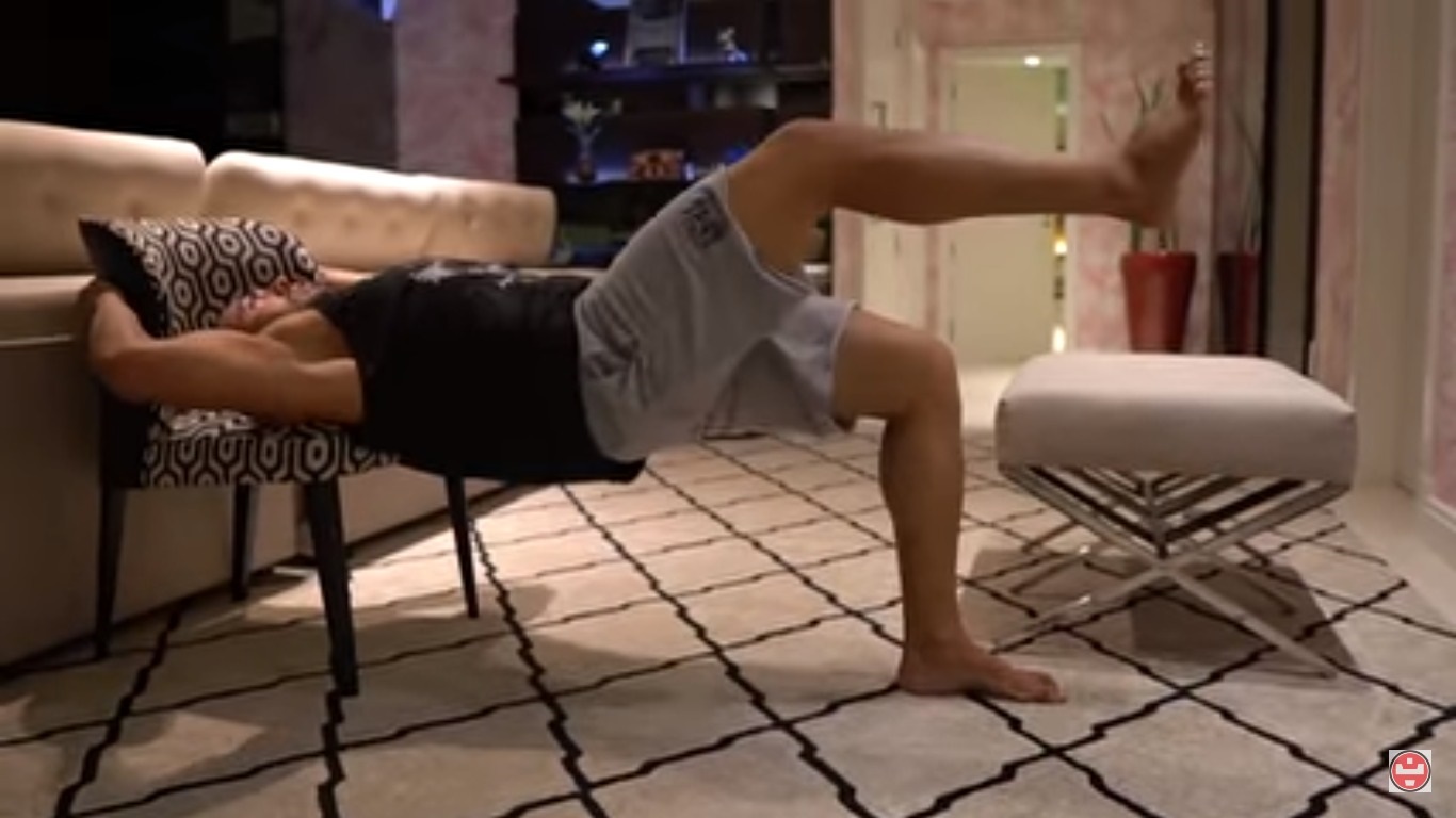 Para trabalhar os glúteos em casa, você precisa de uma cadeira estofada encostada em uma parede. “Faça a elevação pélvica com a cabeça e os ombros apoiados na cadeira. Os dois pés apoiados no chão, com o joelho dobrado. Se estiver fácil, pode fazer o movimento usando apenas uma perna”, orienta Twin.