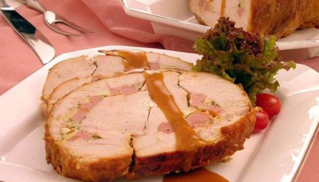Recheie o peito de peru com a mistura de salsichão, feche com palitos e amarre com um barbante culinário. Cubra com papel-alumínio e leve ao forno, preaquecido, por 1 hora e meia. Retire o papel, deixe assar por mais 30 minutos ou até dourar e reserve a calda que se formou. Retire do forno, retire os palitos e o barbante, corte em fatias e cubra com a calda reservada. Decore com alface, tomates cereja e sirva.