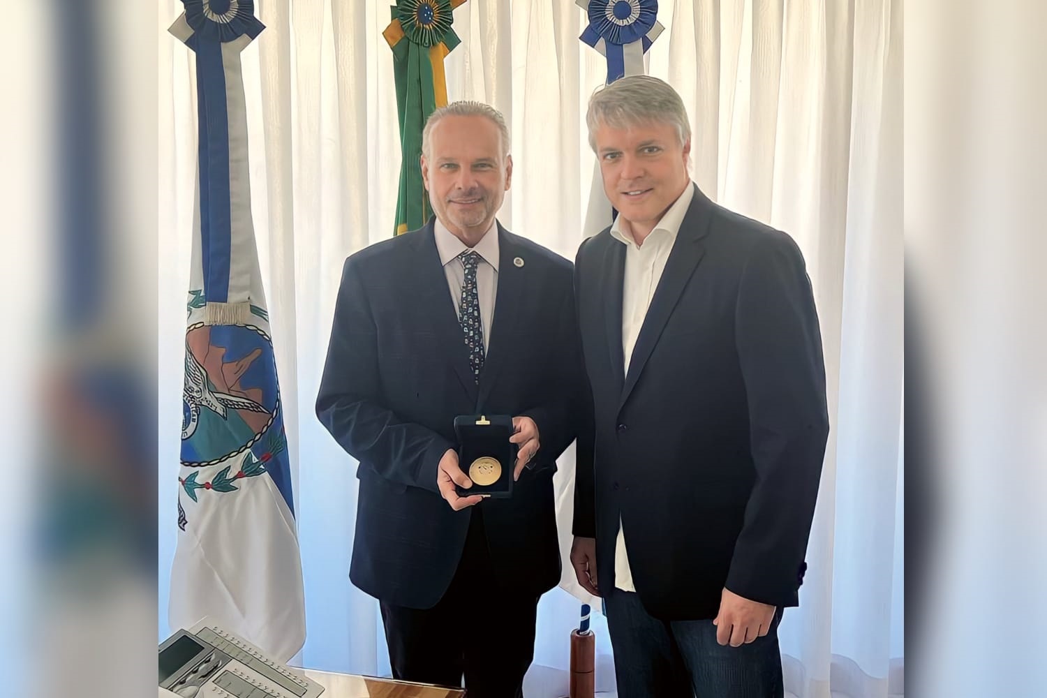Ao final da reunião, em um gesto de reconhecimento pela visita e em reconhecimento ao trabalho do conselheiro, o presidente Luiz Antonio Guaraná presenteou Mario de Mello com uma medalha representativa da instituição carioca.