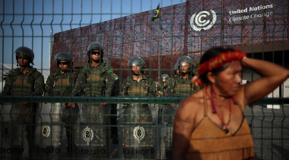 Ao menos duas dezenas de carros da Polícia Militar, bombeiros e agentes da Força Nacional estão de guarda. A manifestação ocorre um dia após o secretário para o Clima das Nações Unidas, Simon Stiell, cobrar o governo brasileiro, em uma carta, por melhorias no esquema de segurança e na infraestrutura para o evento ambiental, que teve 56 mil inscritos. O Ministério da Casa Civil afirma estar tomando providências.