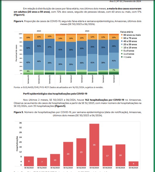 O documento apresenta o cenário no período de 10 de dezembro de 2023 a 10 de fevereiro de 2024. Nesses dois meses, foram registrados 2.751 casos e 142 hospitalizações por Covid-19 no Amazonas. As hospitalizações, ou seja, casos graves da doença, representam 5,1% do total de casos confirmados para o período. Ainda dos 142 hospitalizados, 100 (70%) apresentaram, pelo menos, um fator de risco, como hipertensão, diabetes, cardiopatias, doenças hematológicas e imunodepressão. Ainda no período analisado, foram registrados quatro óbitos por Covid-19 no Amazonas.