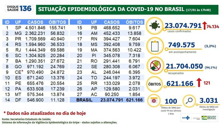 Já o total de mortes causadas pela doença chegou a 621.166, com 121 óbitos entre ontem e hoje. Ainda há 3.031 mortes em investigação, mas esses dados ainda estão passíveis de atualização.