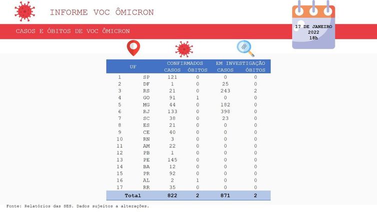 A pasta também informou que foram registrados 822 casos de pessoas infectadas pela variante Ômicron, com incidência confirmada em 17 unidades da Federação, com Pernambuco (145) e Rio de Janeiro (133) responsáveis pelo maior número de casos. Também foram registradas duas mortes, uma em Alagoas e outra em Goiás. Há 871 casos e duas mortes pela nova variante em investigação.