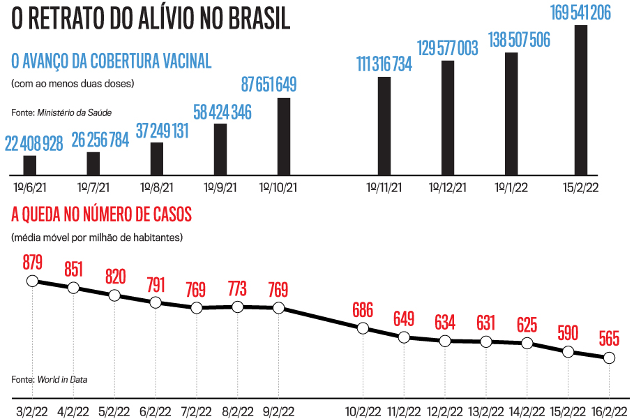 A taxa é o termômetro que afere a velocidade de propagação da doença. No dia 25 de janeiro deste ano, ela estava em 1,78, segundo o Imperial College of London. Isso significava dizer que, naquele momento, 100 pessoas infectadas poderiam contaminar outras 178. Seis dias depois, o índice caiu para 1,69 e na quarta-feira 16 marcava 1,22. Ainda é alto, convém prestar atenção — o ideal é que fique abaixo de 1 —, mas a tendência é claramente de redução no ritmo de transmissão. Dados do Instituto Todos pela Saúde revelaram, ainda, que o volume de testes positivos para Covid-19 caiu de 67% para 51% entre os dias 22 de janeiro e 12 fevereiro.