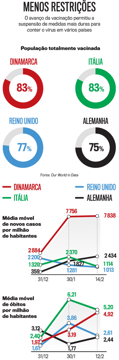 A utilização ao ar livre deixará de ser obrigatória no início de março. Mesmo atravessando um pico de casos, a Dinamarca liberou tudo. “Damos adeus às restrições e dizemos alô para a vida que conhecíamos antes do coronavírus”, celebrou a primeira-ministra Mette Frederiksen. No país escandinavo, o volume de internações é administrável, a taxa de letalidade não passa de 0,22% e 85% da população está plenamente vacinada.