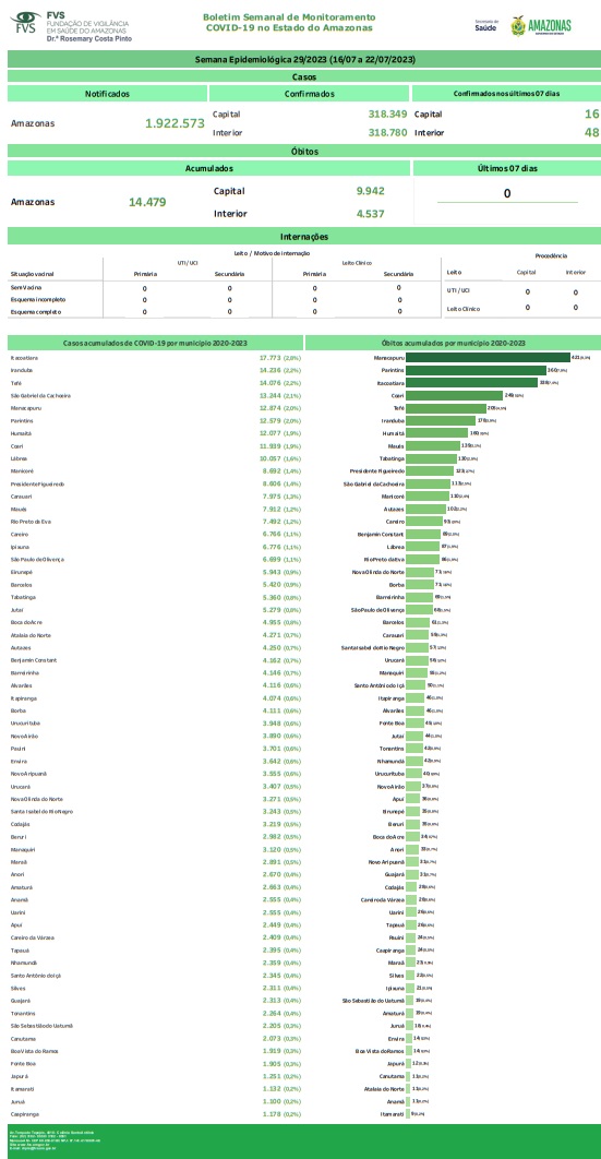 A Fundação de Vigilância em Saúde do Amazonas – Drª Rosemary Costa Pinto (FVS-RCP), vinculada à Secretaria de Estado de Saúde (SES-AM), atualiza, nesta quarta-feira 26/07, os boletins de Covid-19 e vacinação no Estado. As informações são atualizadas às quartas-feiras e estão disponíveis no site da FVS-RCP, no endereço www.fvs.am.gov.br