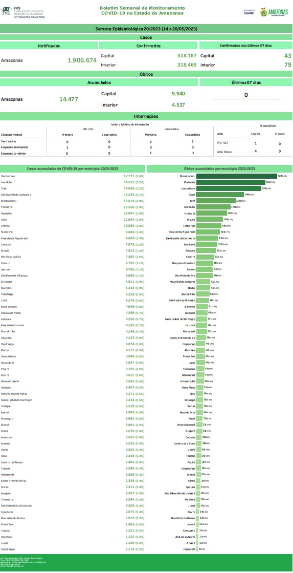 A Fundação de Vigilância em Saúde do Amazonas – Drª Rosemary Costa Pinto (FVS-RCP), vinculada à Secretaria de Estado de Saúde (SES-AM), atualiza, nesta quarta-feira (24/05), os boletins de Covid-19 e vacinação no estado. As informações são atualizadas às quartas-feiras e estão disponíveis no site da FVS-RCP, no endereço www.fvs.am.gov.br