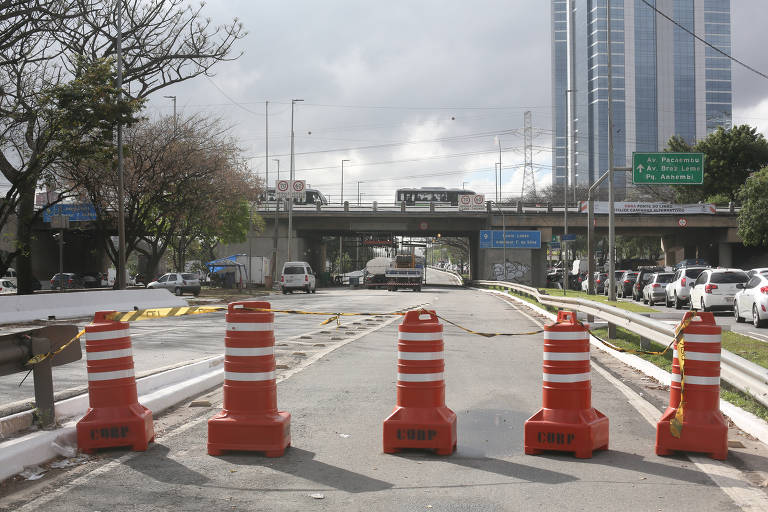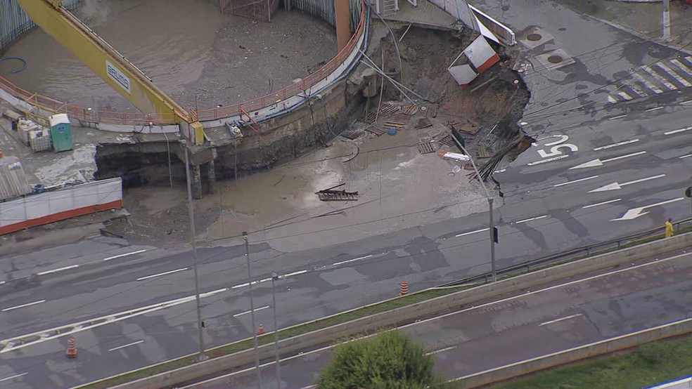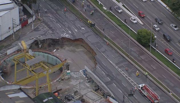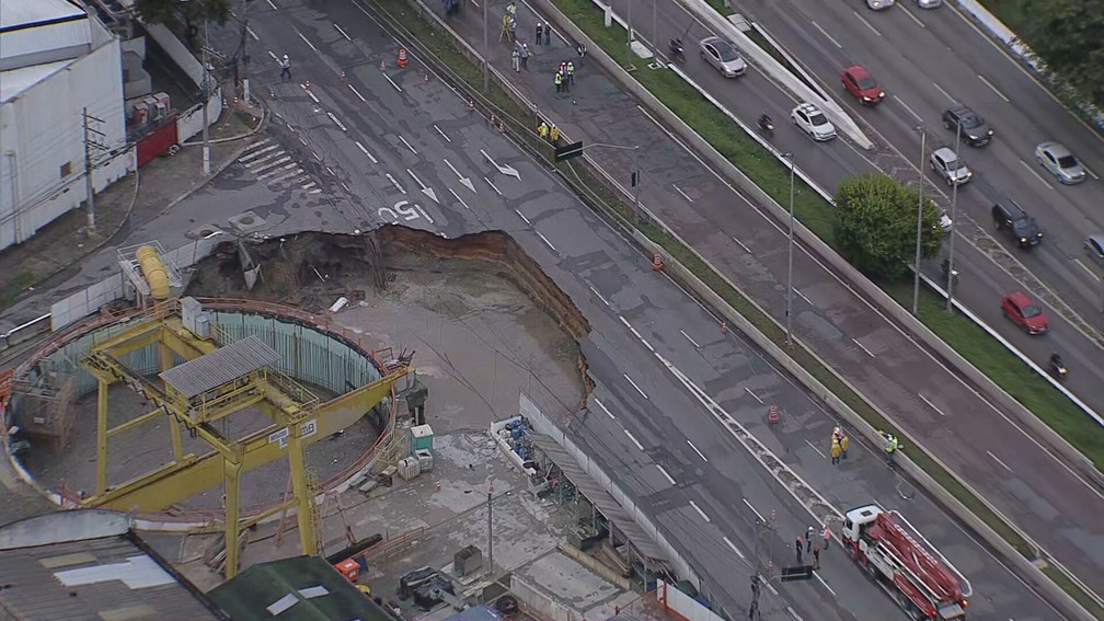 A cratera aberta na Marginal Tietê, na Zona Oeste de São Paulo, nesta terça-feira (1º), aumentou de tamanho e já afetou três das quatro faixas da pista local. O desabamento ao lado das obras da Linha 6-Laranja do Metrô ocorreu por volta das 9h da manhã.