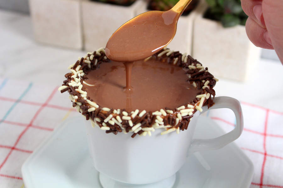 4 - Por fim, sirva o Chocolate Quente em canecas. Se for armazenar a receita para outro dia, o recomendado é que o preparo seja aquecido em uma panela ao fogo baixo.