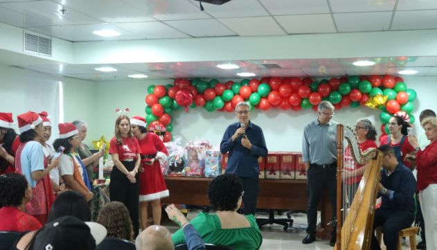 Crianças e adolescentes em tratamento na Fundação Centro de Controle de Oncologia do Estado do Amazonas (FCecon) ganharam, na manhã desta sexta-feira,13/12, uma festa de Natal, no auditório do hospital, unidade vinculada à Secretaria de Estado de Saúde (SES-AM). Os pacientes receberam presentes e lanche, cantaram e receberam a visita do “Papai Noel”.