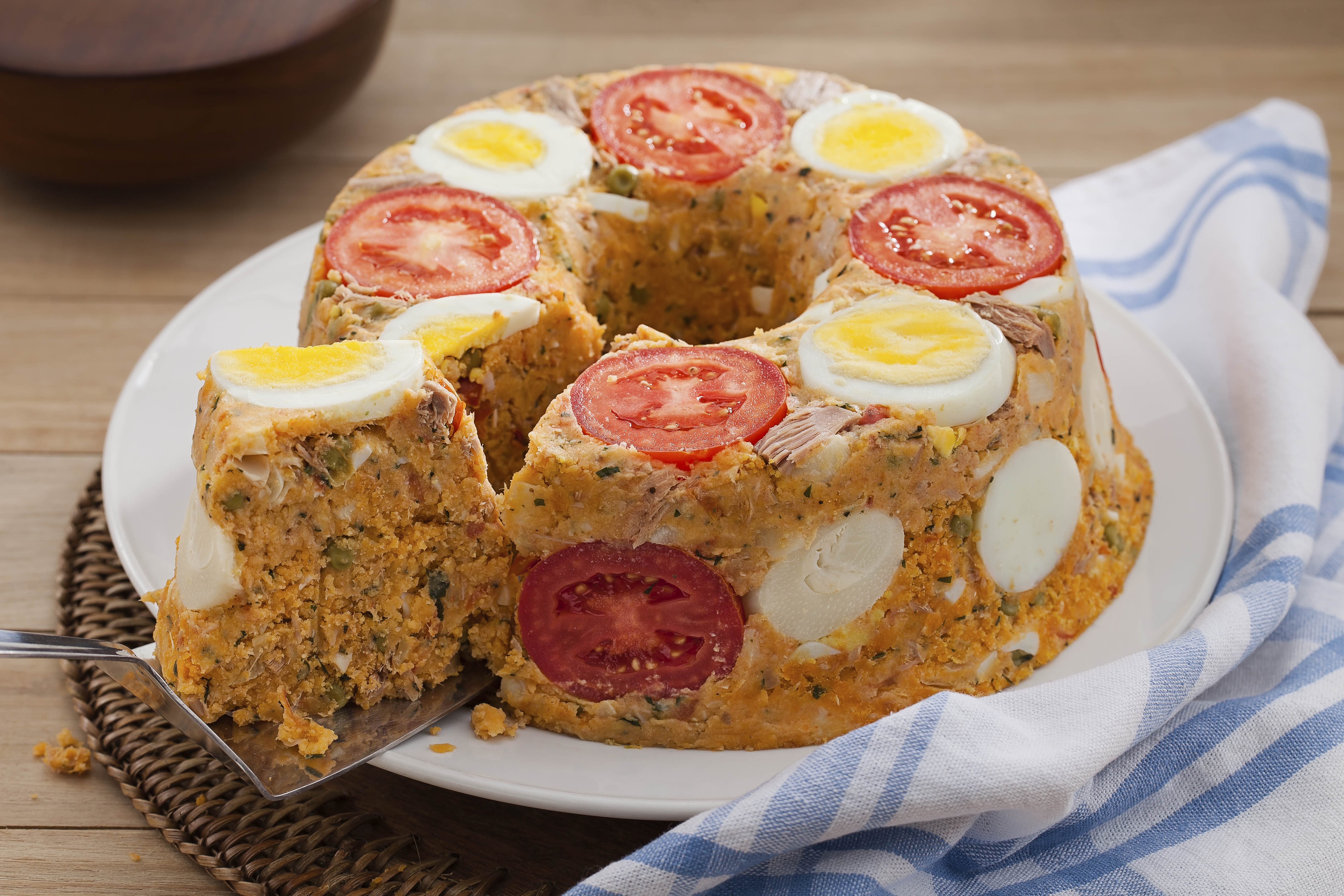 Unte uma fôrma de buraco no média, untada e decore com as rodelas de ovo e de tomate a gosto.