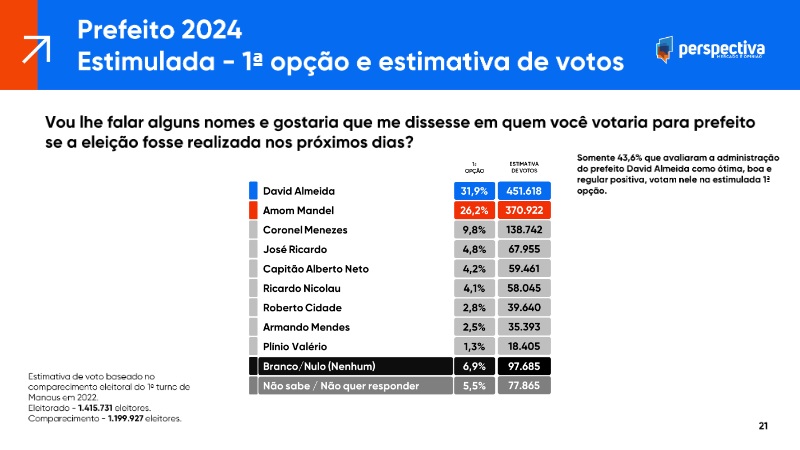 No cenário estimulado, David Almeida lidera a corrida eleitoral para a prefeitura de Manaus com 31,9% das intenções de voto. Em segundo lugar aparece Amom Mandel com 26,2%.