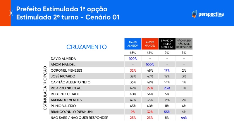 O primeiro aponta uma vitoria apertada de David Almeida com 45% de intenção de votos em um eventual segundo turno da eleição e Amom Mandel com 43%.